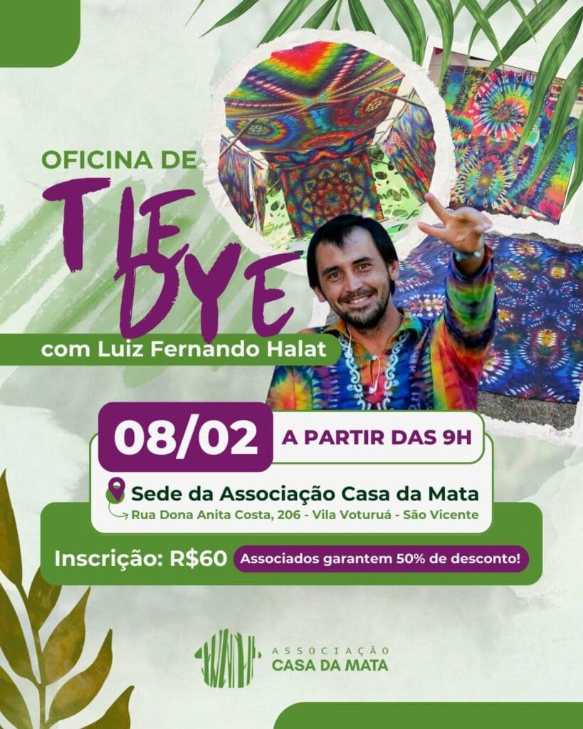 No dia 08/02, vamos receber o Luiz Fernando Halat, artista, permacultor e criador da Mundo Tie Dye, para uma oficina que une técnica, acolhimento e expressão pessoal. A vivência é aberta a todas as pessoas que desejam experimentar o tingimento artesanal como um caminho de criação e reconexão com o fazer manual.